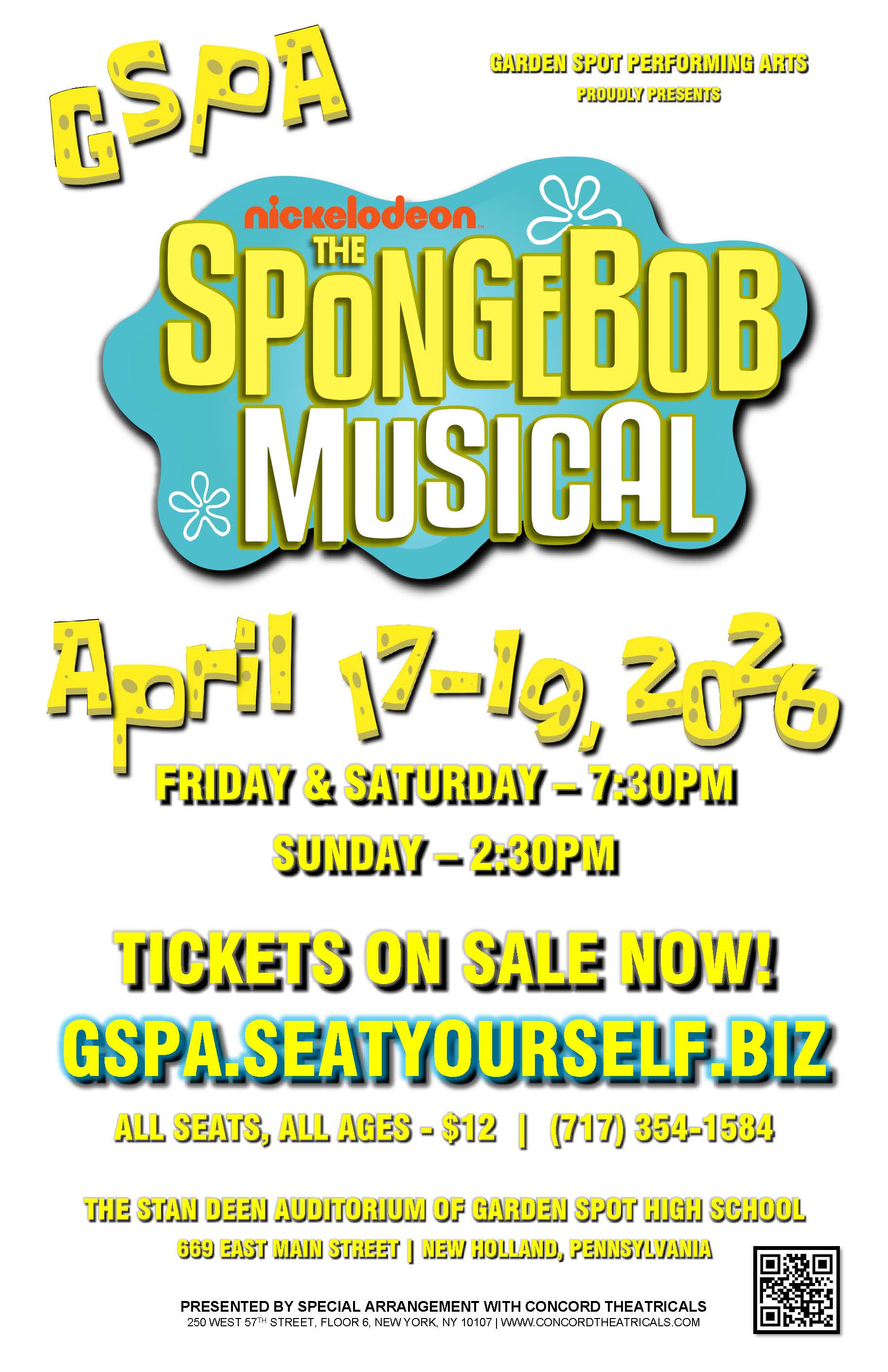 March 26, 2026 GSPA Spring Play Flyer- The SpongeBob Musical Garden Spot Performing Arts Presents: The SpongeBob Musical GSPA's family-friendly show is full of laughs and a surprisingly heartfelt & meaningful message about the importance of friendship, c...
